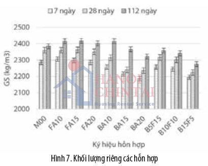 Ảnh hưởng của FA và SCBA đến khối lượng riêng tương tự khối lượng thể tích. Khối lượng riêng tăng theo thời gian do lấp đầy bằng chất kết dính. Khối lượng riêng của các 10 loại vữa qua 7, 28 và 112 ngày được thể hiện ở Hình 7. Từ 7 đến 28 ngày, khối lượng riêng của M00 tăng 3,28%. Đối với hỗn hợp chứa FA, SCBA và hỗn hợp vữa ba thành phần lần lượt là 2,66%, 1,99% là 2,14%. Từ 28 đến 112 ngày, khối lượng riêng của hỗn hợp chứa FA và SCBA tăng 2,29%, 4,58% so với 1,06% của M00 và 1,96% của hỗn hợp vữa ba thành phần. Sự tăng mạnh khối lượng riêng của các hỗn hợp chứa FA và SCBA sau 28 ngày tuổi liên quan đến phản ứng tạo C-S-H của FA, SCBA ở tuổi muộn [8, 19].