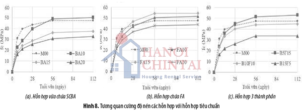 Cường độ hỗn hợp vữa 3 thành phần được thể hiện ở Hình 8c. Hỗn hợp chứa 10% FA và 10% SCBA có cường độ tương đương hỗn hợp đối chứng. Trong khi đó, hỗn hợp chứa 15% FA kết hợp với 5% SCBA đạt cường độ cao. Ở 28 ngày tuổi, cường độ nén của hỗn hợp này tương đương hỗn hợp đối chứng. Ở 56 ngày, hỗn hợp này có cường độ nén 51,58 MPa lớn hơn 9% và ở 112 ngày, đạt giá trị 53,05 MPa lớn hơn 12% hỗn hợp đối chứng. FA với kích thước hạt nhỏ, dạng cầu dễ lấp đầy lỗ rỗng trong cấu trúc hạt SCBA làm cho độ đặc chắc hỗn hợp được cải thiện. Vị trí gồ gề của SCBA tạo điều kiện chứa đựng mầm phản ứng tạo chất kết dính thứ cấp cho vữa, làm cường độ vữa phát triển muộn [9, 19].