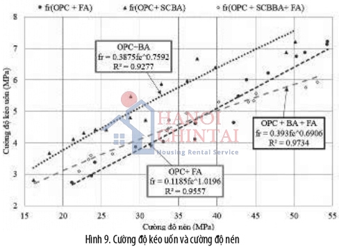 Cường độ kéo uốn và cường độ nén của các hỗn hợp chứa FA và SCBA được hồi quy từ thực nghiệm với hệ số tương quan R² > 0,92 cho thấy độ phân tán nhỏ và cường độ của hỗn hợp đồng nhất cao. Khả năng chịu kéo uốn và khả năng chịu nén của hỗn hợp vữa thể hiện hai trạng thái làm việc khác nhau, phụ thuộc vào nhiều yếu tố và không có mối liên hệ giải tích. Cường độ kéo uốn của hỗn hợp chứa SCBA cao nhất so với hỗn hợp chứa FA và vữa ba thành phần. SCBA dạng sợi với vai trò như cốt liệu đã cải thiện khả năng chịu kéo [19]. Vữa chứa FA có cường độ kéo tăng lên so với hỗn hợp đối chứng. Kết quả này phù hợp với nghiên cứu của Elisabete R. Teixeira và cộng sự [9] khi xét tỉ lệ giữa cường độ kéo uốn và cường độ nén của hỗn hợp chứa 50% FA lớn hơn 25% và hỗn hợp chứa 100% xi măng là 19% ở 28 ngày tuổi.