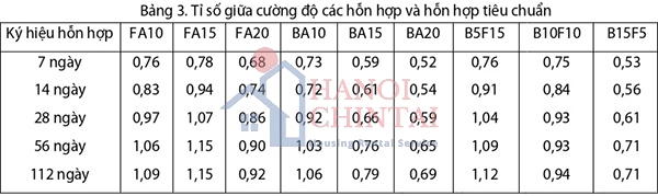 Tỉ lệ cường độ nén các hỗn hợp và hỗn hợp đối chứng thể hiện ở Bảng 3. Tỉ lệ này lớn hơn 0,75 là vật liệu pozzolan ASTM C618 [7]. Theo đó, hỗn hợp chứa 10% và 15% FA là vật liệu pozzolan. Hỗn hợp chứa 20% SCBA hoặc 15% SCBA kết hợp với 5% FA không đạt được điều này. Sau 28 ngày, hỗn hợp chứa 20% FA và 10% SCBA là vật liệu pozzolan với tỉ số với cường độ nén của M00 lần lượt là 0,86 và 0,92. Khi tăng tỉ lệ thay thế xi măng bằng SCBA tăng lên 15%, hỗn hợp có tính pozzolanic ở 56 ngày.