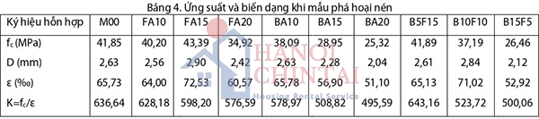 Tỉ lệ ứng suất và biến dạng tương đối của các hỗn hợp khi phá hoại nén được thể hiện ở Bảng 4. Hệ số K của hỗn hợp chứa SCBA nhỏ hơn hỗn hợp chứa FA và M00. Hỗn hợp chứa SCBA, có K = 527,79 thấp hơn M00 là 636,64 và 600,99 đối với hỗn hợp chứa FA. Hỗn hợp vữa 3 thành phần ghi nhận K = 555,65 thấp hơn hỗn hợp M00 12,72%.