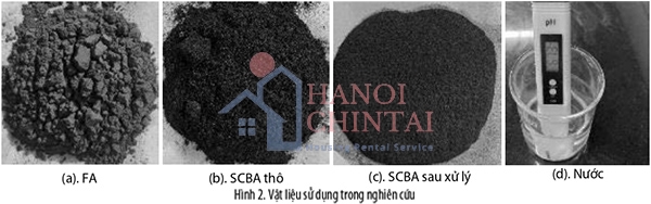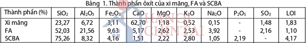 FA và SCBA được phân tích thành phần theo phương pháp huỳnh quang (tia X). Bảng 1 thể hiện thành phần ôxít chính. SiO2, Al2O3 và Fe2O3 là thành phần của FAvà SCBA. Trong khi CaO, SiO2 và Al2O3 là ôxít chính của xi măng. Sau khi xử lý, SCBA có lượng mất khi nung (LOI) thấp là kết quả của quá trình loại bỏ phần chưa cháy sau khi ngâm nước, nung lại và sàng.