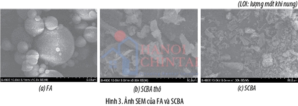Hình dạng hạt FA và SCBA thu được thông qua thí nghiệm SEM (Scanning Electron Microscope) bằng kính hiển vi điện tử khi chiếu chùm điện tử hẹp quét trên bề mặt mẫu. Kết quả quan sát ở Hình 3: FA gồm hạt tròn, kích thước đa dạng. SCBA không đồng nhất, nhiều lỗ rỗng và xốp.