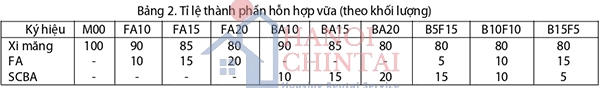 Hỗn hợp cố định tỉ lệ cát và chất kết dính bằng 2,75. Lượng nước điều chỉnh để độ linh động của hỗn hợp tương đương. Tổng cộng 10 hỗn hợp vữa được chế tạo với thành phần vật liệu thể hiện ở Bảng 2. Hỗn hợp đối chứng ký hiệu M00 chứa xi măng, cát và nước. Thay thế 10%, 15%, 20% khối lượng xi măng của M00 bằng FA và SCBA lần lượt được 6 hỗn hợp: FA10, FA15, FA20 và BA10, BA15, BA20. Thay thế 20% khối lượng xi măng của M00 bằng FA kết hợp với SCBA được 3 hỗn hợp 3 thành phần: B5F15 (5% SCBA + 15% FA), B10F10 (10% SCBA + 10% FA) và B15F15 (15% SCBA + 5% FA).