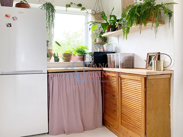 Để tránh làm rối mắt, bạn có thể sử dụng rèm che phía trước khu vực để đồ. Đây không chỉ là giải pháp thẩm mỹ giúp không gian trở nên gọn gàng hơn mà còn có thể đóng vai trò như một lớp cách âm nhẹ, mang lại sự yên tĩnh và thư giãn cho căn phòng.