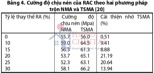 - Phương pháp trộn: 3 phương pháp trộn đã được báo cáo là có ảnh hưởng tích cực đến hiệu suất của RAC, đó là phương pháp trộn hai giai đoạn (TSMA), phương pháp trộn vữa (MMA) và phương pháp trộn trong cát (SEMA). Hiệu quả của các phương pháp trộn này được trình bày trong Bảng 4.