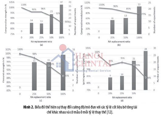 Tóm lại, cường độ chịu nén, mô đun đàn hồi nén, cường độ chịu uốn và cường độ kéo của RAC thường có xu hướng giảm khi tỷ lệ thay thế RA tăng. Nếu sử dụng 100% RCA, cường độ chịu nén trung bình, mô đun đàn hồi, cường độ chịu uốn và độ bền kéo trung bình của RAC sẽ giảm lần lượt khoảng 40%, 40%, 20% và 40% so với NAC.