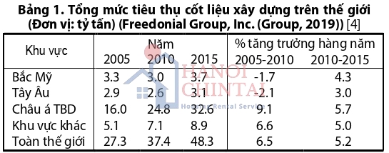 Trái đất đang chứng kiến tình trạng suy thoái môi trường như hiện tượng nóng lên toàn cầu hoặc khan hiếm tài nguyên. Để đối phó với những mối đe dọa như vậy, chính phủ các nước đang hành động. Ví dụ, Thỏa thuận Paris năm 2015 tập trung vào việc cắt giảm phát thải khí nhà kính. Thỏa thuận Xanh châu Âu, được thông qua vào năm 2020, đưa ra các sáng kiến rằng sẽ không có lượng khí thải carbon (trung hòa carbon) vào năm 2050 và tăng trưởng kinh tế sẽ tách rời khỏi việc sử dụng tài nguyên. Chính sách tương tự cũng được Chính phủ Trung Quốc thực hiện nhằm đạt được mục tiêu trung hòa carbon vào năm 2060. Bê tông xi măng, loại vật liệu xây dựng được sử dụng rộng rãi nhất, đã thống trị thị trường vật liệu xây dựng từ những năm 1900 [1], chiếm khoảng 8% tổng lượng khí thải carbon dioxide toàn cầu [2]. Người ta chấp nhận rộng rãi rằng bê tông là vật liệu tổng hợp bao gồm các cốt liệu (tức là cát, sỏi hoặc đá dăm) được liên kết với nhau bằng chất kết dính xi măng (tức là hỗn hợp nước và vật liệu kết dính). Sản lượng xi măng của thế giới đã tăng gấp 3 lần từ 1,10 lên 3,27 tỷ tấn trong hai thập kỷ qua. Với việc xây dựng ngày càng tăng, ước tính sản lượng xi măng có thể đạt 4,83 tỷ tấn vào năm 2030 [3]. Điều này có thể cung cấp cho việc sản xuất khối lượng bê tông lớn, đòi hỏi phải tăng dần các nguồn tài nguyên như cốt liệu tự nhiên (NA), thường chiếm 60 - 75% tổng khối lượng bê tông. Năm 2015, khoảng 48,3 tỷ tấn NA đã được tiêu thụ trên toàn thế giới và mức tăng trưởng cứ sau 5 năm được ước tính là hơn 5% (Bảng 1) [4]. Người ta dự đoán rằng nhu cầu NA trong hai hoặc ba thập kỷ tới sẽ tăng gấp đôi.