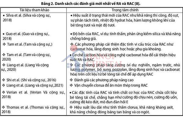 Có nhiều tài liệu và báo cáo khoa học quan trọng đánh giá RA và RA. Cụ thể, các đánh giá được tóm tắt trong Bảng 2. Những đánh giá này liên quan đến nhiều vấn đề như hiệu suất khả thi của RAC, các biện pháp cải thiện các chỉ tiêu vật lý/cơ học của RAC, độ bền kết cấu/ứng dụng RAC và đánh giá các phương pháp nâng cao.