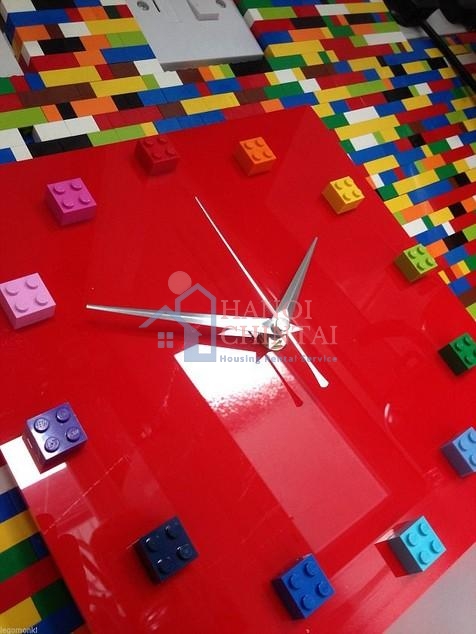 Chiếc đồng hồ Lego rực rỡ này kết hợp hài hòa với tấm chắn ở nhà bếp cũng được lắp ráp từ những mảnh ghép đồ chơi.