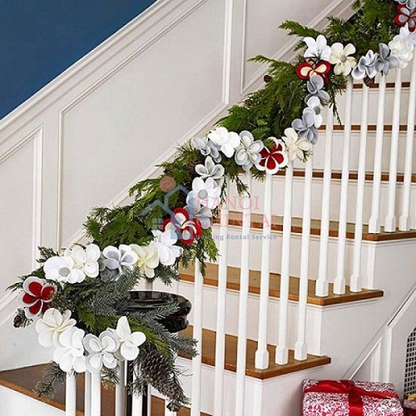 Cầu thang của nhà bạn sẽ thêm phần đáng yêu hơn khi có những cành thông kết hoa và những chiếc nơ xinh xắn hoặc những chiếc tất màu mè đính vào. Tất cả sẽ khiến cho căn nhà được cuốn hút hơn trong dịp Giáng sinh.