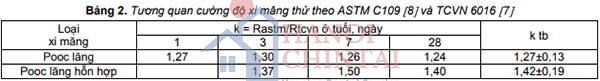 Vì sự khác biệt trên, cường độ xi măng thử theo C109 của Mỹ [8], ký hiệu R astm thường thấp hơn theo tiêu chuẩn Việt Nam [7], ký hiệu Rtcvn. Theo nghiên cứu của các tác giả [12] trên 39 mẫu xi măng PC và PCB sản xuất tại Việt Nam, có thể tham khảo được hệ số tương quan k = Rastm/Rtcvn như trên bảng 2.