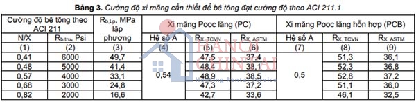 Đồng thời, để thỏa mãn cường độ bê tông ứng với các giá trị tỷ lệ N/X theo ACI 211.1, xi măng phải đạt mức cường độ nhất định. Kết quả được tính toán trên bảng 3.