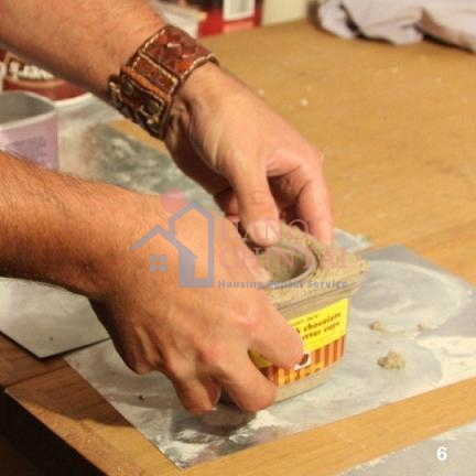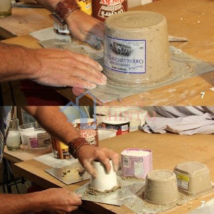 - Đầu tiên bạn trộn xi măng vào một chiếc chậu hoặc xô to, đủ để làm được nhiều chiếc một lúc. Sau đó dùng dao bả xúc xi măng đổ vào các vỏ cốc lớn sao cho gần đầy cốc.