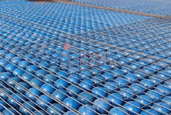 Lắp đặt hộp rỗng: Đặt các hộp rỗng (như hộp nhựa tái chế) vào vị trí theo bản vẽ thiết kế, cố định chúng bằng các thanh nối hoặc thép chữ C để chống lực đẩy nổi và giữ ổn định.