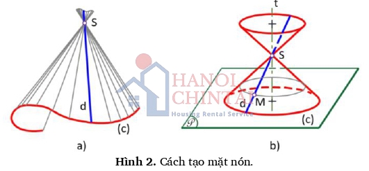 Mặt nón là mặt tạo bởi một đường thẳng chuyển động (gọi là đường sinh) đi qua một điểm cố định (gọi là đỉnh của mặt nón) và tựa trên một đường cong (gọi là đường chuẩn của mặt nón). Hình 2.a biểu diễn mặt nón được tạo bởi đường sinh d chuyển động đi qua đỉnh S cố định và tựa trên đường cong (c). Trường hợp đặc biệt, khi quay đường thẳng d quanh một trục t cắt nó tại S ta có nón tròn xoay như Hình 2.b. Mỗi điểm trên d vạch thành một đường tròn (gọi là đường tròn vỹ tuyến). Nón tròn xoay có đường chuẩn (c) là đường tròn, mặt phẳng chuẩn P (mặt phẳng chứa đường chuẩn) vuông góc với trục quay t. [1] [2] [3]