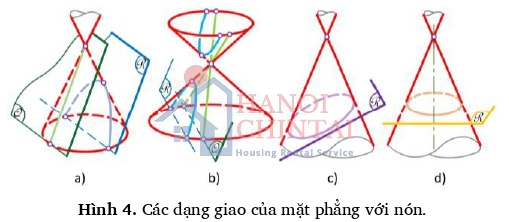 - Hyperbol khi mặt phẳng song song với hai đường sinh của nón (Hình 4.b - mặt phẳng R cắt nón giao là hyperbol).
