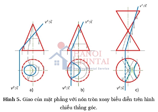 Để vẽ giao của một mặt phẳng với một mặt nón thường tìm nhiều điểm chung của chúng. Mỗi điểm chung là giao điểm của một đường sinh thẳng của mặt nón với mặt phẳng đã cho. Vấn đề quy về cách vẽ giao điểm của một đường thẳng với một mặt phẳng. Ngoài ra, cần tìm các yếu tố xác định giao như: tâm, trục, đường kính liên hợp, tiếp tuyến, tiệm cận. Hình 5.a biểu diễn giao của mặt phẳng chiếu đứng R với mặt nón tròn xoay, mặt phẳng R cắt qua mọi đường sinh của nón - giao tuyến là elip (hình chiếu đứng elip giao suy biến thành đoạn thẳng trùng với v1R, hình chiếu bằng là elip). Hình 5.b biểu diễn giao của mặt phẳng chiếu đứng R với mặt nón tròn xoay, mặt phẳng R song song với một đường sinh của nón - giao tuyến là parabol (hình chiếu đứng parabol giao suy biến thành đoạn thẳng trùng với v1R, hình chiếu bằng là parabol). Hình 5.c biểu diễn giao của mặt phẳng chiếu đứng R với mặt nón tròn xoay, mặt phẳng R song song với hai đường sinh của nón -giao tuyến là hyperbol (hình chiếu đứng hyperbol giao suy biến thành đoạn thẳng trùng với v1R, hình chiếu bằng là hyperbol).
