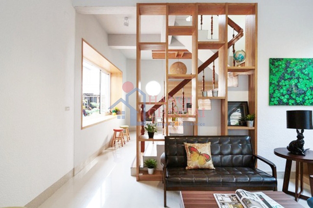 Kệ trang trí đồng thời cũng là vách ngăn giữa phòng khách và nhà bếp.