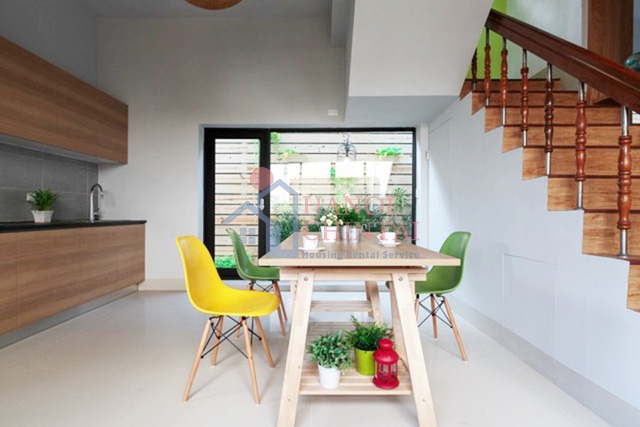 Bàn gỗ, ghế ăn hiện đại đặt cạnh bếp và cầu thang thuận tiện trong việc di chuyển.