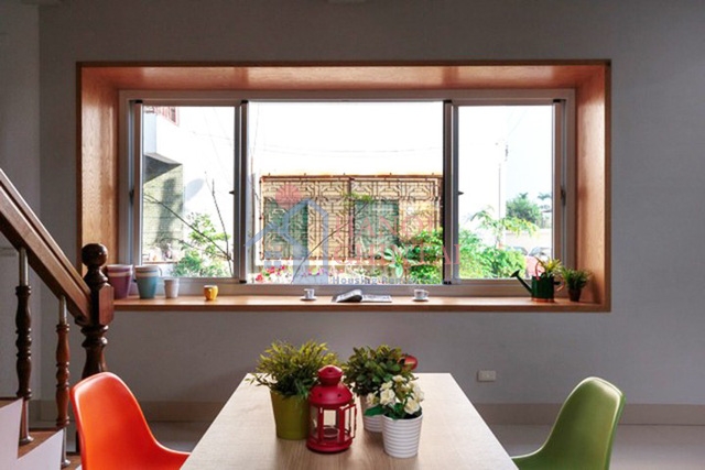 Khung cửa sổ bằng sắt cũ được thay thế bằng bậu cửa gỗ có thể làm bàn uống nước, đọc sách.