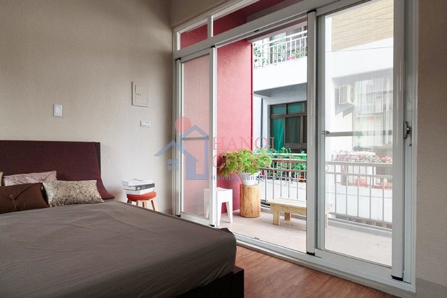 Cửa trượt bằng kính ngăn cách giữa ban công và giường ngủ.