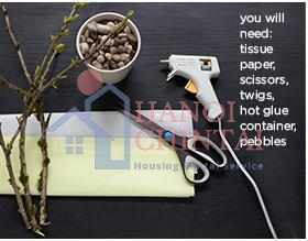 Bạn cần giấy làm hoa màu trắng và vàng nhạt, kéo, súng bắn keo, đá cuội. Ngoài ra tìm chọn cho mình một cành đào hoặc cành cây trông hơi xù xì, gai góc.