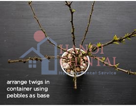 - Chọn một chiếc bình đơn giản có chiều cao phù hợp. Với đào tuyết thì chiều dài của thân gấp 3 lần chiều cao của bình là vừa đẹp.