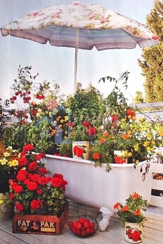 Đặt bồn tắm trên khu vườn sân thượng và bỏ đất vào trong. Hoặc có thể bỏ các vật liệu nâng cao phần đáy để đặt các chậu trồng hoa tạo chậu hoa khổng lồ bắt mắt trên sân thượng của gia đình.