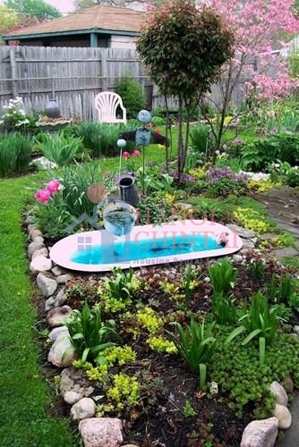 Bồn tắm cũ kỹ có thể được đặt ở một góc vườn và trồng những loại cây mà bạn yêu thích. Khoảng xanh tươi của bèo tấm hay cây cỏ được trồng bên trong bồn sẽ giúp khu vườn thêm đa dạng và ấn tượng hơn.