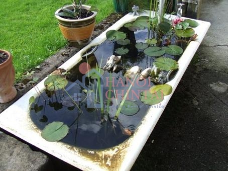 Bồn tắm vuông được đặt cố định ở một góc sân vườn. Bên trong được trồng sen súng và tạo tiểu cảnh xung quanh.