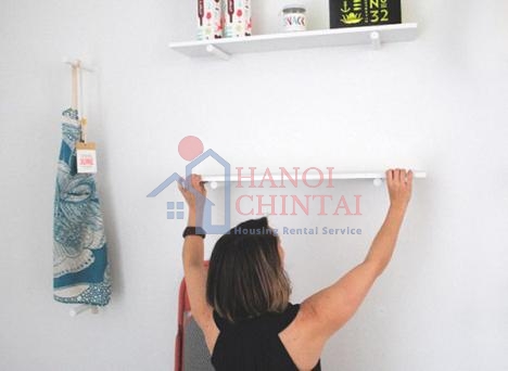 Cuối cùng: Bạn dùng khoan cố định thanh gỗ tròn vào bức tường một cách chắc chắn, 2 thanh gỗ sẽ đỡ 1 tấm kệ lưu trữ.