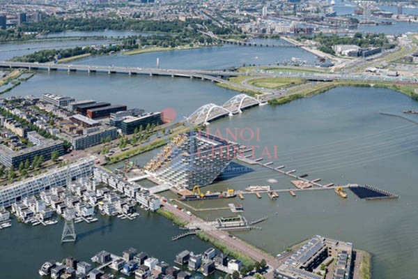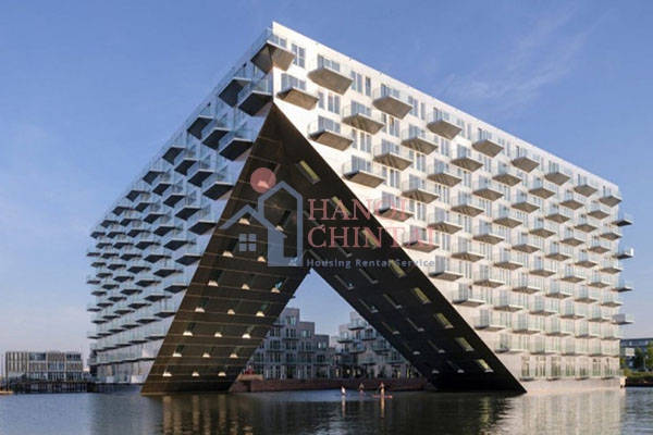 Toà nhà dân cư Sluishuis nằm trôi nổi trên bờ sông IJ, thành phố Amsterdam, Hà Lan với thiết kế mới lạ tạo ra ảo giác như đang “nổi trên mặt nước” và kết cấu trông giống phần mũi của một con tàu khi nhìn từ một số góc độ. Tòa nhà này được xây dựng với ý tưởng là nơi để sống trên mặt nước.