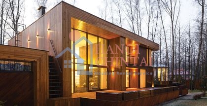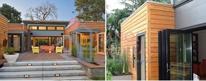 Nhà gỗ phong cách hiện đại thường có vẻ ngoài gây ấn tượng từ cái nhìn đầu tiên. Hiện nay, những ngôi nhà theo phong cách này thường làm nổi bật sự tương phản giữa hai vật liệu và gỗ và kính với những ô cửa kính lớn cùng hệ thống đèn chiếu với tông màu ấm áp.