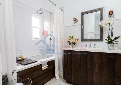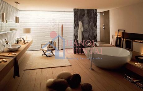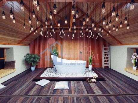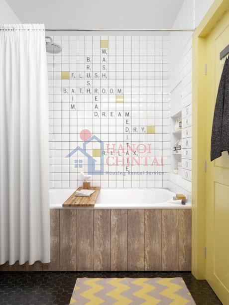 Vẻ đẹp của nhà tắm được mang lại nhờ thiết kế trần nhà cầu kì với hàng chục những bóng đèn nhỏ, khiến bạn không khỏi choáng ngợp. Trần và sàn đều sử dụng chất liệu gỗ tái chế, một bồn tắm nằm chính giữa căn phòng … tất cả đã tạo nên một bối cảnh trên cả tuyệt vời cho căn phòng. Sẽ không quá khi bạn chấm cho phòng tắm này 5 sao tiêu chuẩn.