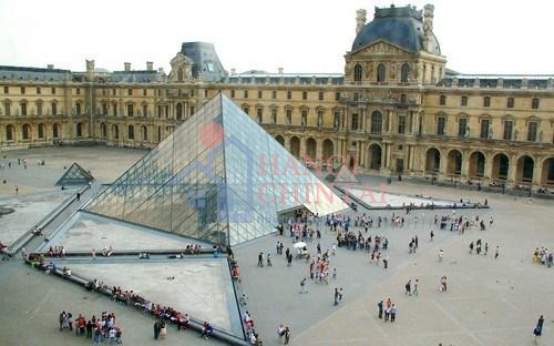 Kim tự tháp bằng kính nằm ở giữa sân Napoléon của bảo tàng Louvre, Paris có lẽ là tòa nhà bằng kính nổi tiếng nhất trong danh sách này. Toàn bộ kim tự tháp được xây bằng kính cùng các khớp nối kim loại, cao 20,6m với đáy hình vuông mỗi cạnh 35m. Kim tự tháp này gồm tổng cộng 603 tấm kính hình thoi và 70 tấm hình tam giác.
