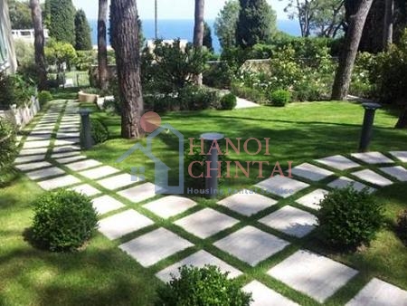 sân vườn một lối mòn lát đá mát lạnh với lớp cỏ xanh mềm len giữa những