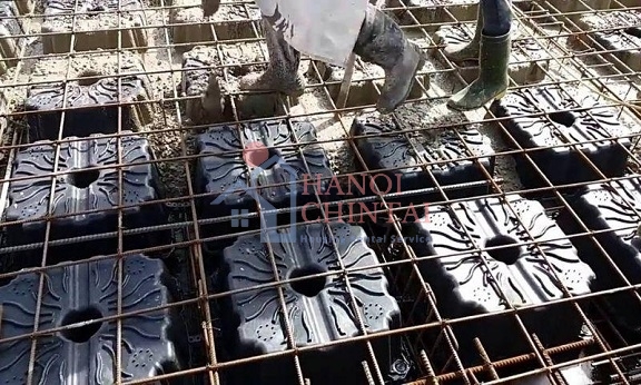 Tiếp theo, tiến hành đổ bê tông vào những lỗ trống giữa các hộp Nevo. Cuối cùng là bảo dưỡng sàn phẳng Nevo theo các bước quy định.
