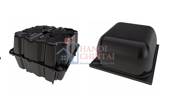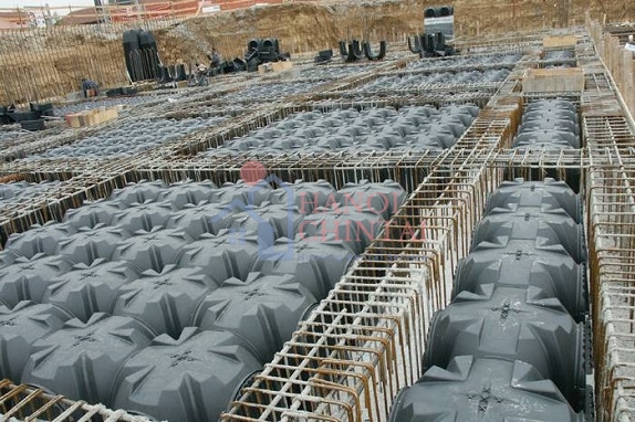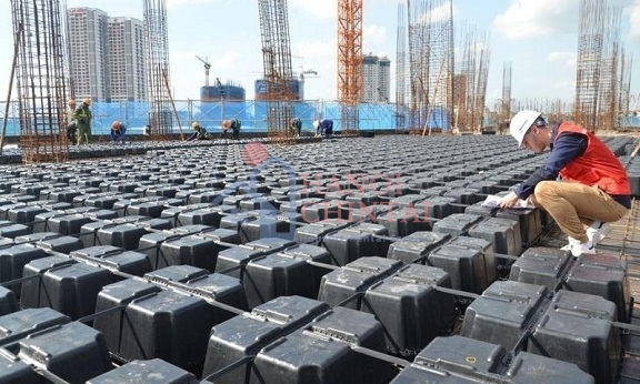 - Hộp nhựa: Kích thước hình vuông 52×52cm, chiều cao 10cm, 13cm, 16cm, 18cm, 21cm… Hộp sử dụng có 4 chân côn kê lên mặt dưới sàn để hộp tự đứng được, các thanh giằng nhựa nối với hộp để tạo nên các kích thước dầm chìm theo 2 phương. Trên mặt hộp có gờ để kê thép lên 1,5cm, đảm bảo khoảng cách kê theo tiêu chuẩn.