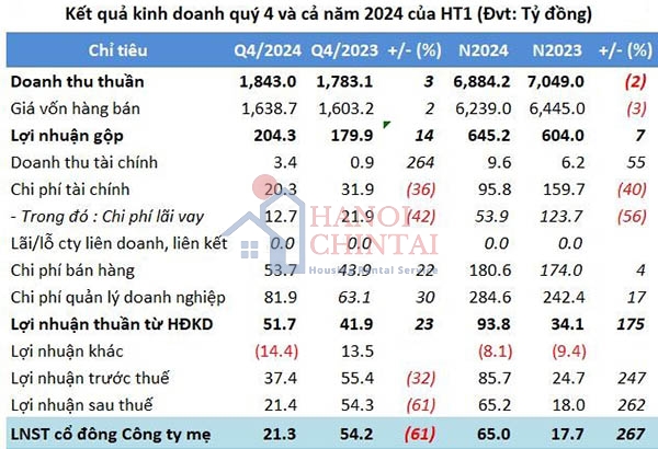 Công ty CP Xi măng VICEM Hà Tiên (HOSE: HT1) vừa công bố báo cáo tài chính quý 4/2024 ghi nhận doanh thu thuần đạt 1.843 tỷ đồng, tăng nhẹ 3% so với cùng kỳ năm ngoái. Sau khấu trừ giá vốn, doanh nghiệp lãi gộp hơn 204 tỷ đồng, tăng 14%.