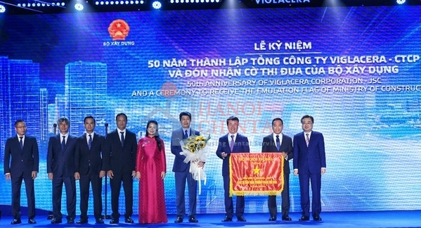 Lãnh đạo Viglacera nhận Cờ thi địa từ Bộ trưởng Bộ Xây dựng tại lễ kỷ niệm 50 năm thành lập.