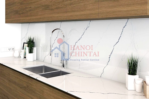 Vật liệu ốp tường bếp đá marble mang đến vẻ đẹp đơn giản mà sang trọng.
