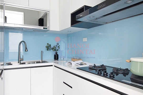 Khu vực nấu nướng càng thêm sáng sủa khi sử dụng vật liệu ốp tường bếp là kính cường lực.