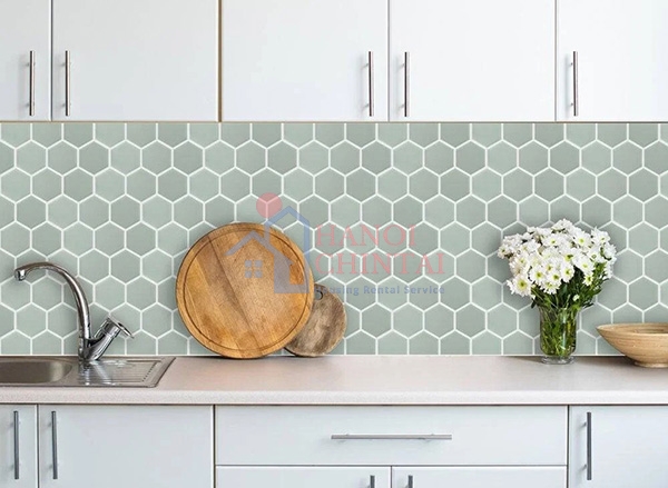 Vật liệu ốp tường bếp gạch mosaic hình lục giác màu xanh dịu dàng, trang nhã.
