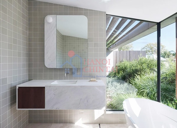 Sân hiên dốc ở tầng trên được trồng nhiều cây xanh để tạo thành một "ốc đảo đô thị" bên ngoài ngôi nhà và mang đến trải nghiệm tắm ngắm cảnh nhưng vẫn đảm bảo riêng tư cho gia chủ.