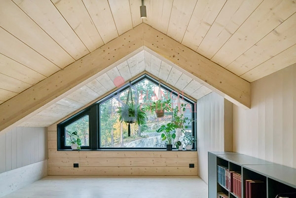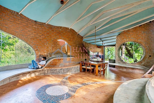 Ngôi nhà này được thiết kế uốn lượn có phần khác lạ, cùng với các cửa sổ lớn, hình bầu dục nằm dọc bên trong ngôi nhà và thu hút ánh sáng ban ngày cũng như cung cấp tầm nhìn ra khu rừng bên ngoài.