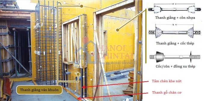 Một nhân tố quan trọng trong ván khuôn bê tông không trát là thanh giằng ván khuôn dùng một lần. Ở Nhật bản, người ta sử dụng một số loại thanh giằng ván khuôn chủ yếu như hình vẽ bên dưới. Các thanh giằng này không chỉ có tác dụng chống phình mà còn có tác dụng chống móp để đảm bảo kích thước cấu kiện chuẩn xác nhất.