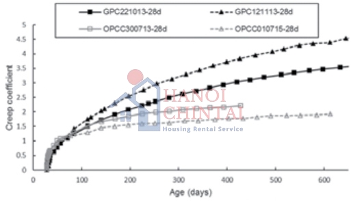 Các nghiên cứu về từ biến của GPC trên thế giới không nhiều nhưng lại cho kết quả rất khác nhau, nghiên cứu S. E. Wallah and B. V. Rangan (2006) [22]: cho thấy rằng, hệ số từ biến sau 1 năm của GPC với cường độ 40, 47 và 57 MPa nằm trong khoảng 0,6 đến 0,7. Liu và cộng sự [21] nghiên cứu GPC từ hỗn hợp tro bay và metakaolin cho thấy hệ số từ biến thấp là 0,609 sau 60 ngày… nhỏ hơn hệ số từ biến của bê tông thông thường có cùng cường độ. Kết quả nghiên cứu của Chi Hou Un năm 2017 [18] cho thấy rằng hệ số từ biến của GPC có sử dụng vật liệu tro bay và xỉ lò cao cao hơn của bê tông thông thường có cùng cường độ (Hình 1). Như vậy cũng tương tự bê tông thông thường biến dạng từ biến phụ thuộc vào tỷ lệ tro bay, xỉ lò cao, chất hoạt hóa, quá trình bảo dưỡng, và giá trị hệ số từ biến của GPC cao hơn hoặc nhỏ hơn bê tông thông thường.
