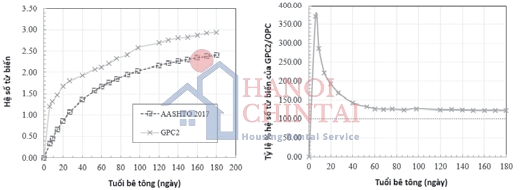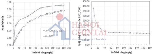 Dựa vào biểu đồ trên Hình 9 và Hình 10 cho thấy rằng: Hệ số từ biến của GPC luôn lớn hơn OPC; Trong 6 ngày đầu tỷ số giữa hệ số từ biến của GPC và OPC tăng rất nhanh lên đến 3,75 lần và giảm nhanh còn 1,7 lần ở ngày thứ 27, và sau đó tỷ lệ giảm chậm và giai đoạn từ ngày thứ 60 biểu đồ gần như song song với nhau. Hệ số từ biến của GPC ở thời điểm 180 ngày là 2,9.