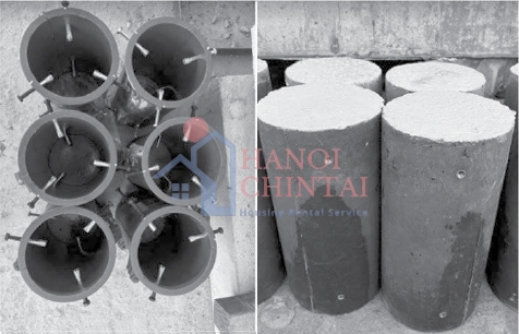 - Tiến hành chế tạo 01 tổ mẫu trụ kích thước 15x30 cm để đo từ biến. Mẫu được chế tạo trong khuôn kín được chôn sẵn chốt gắn dụng cụ đo từ biến (Hình 2);